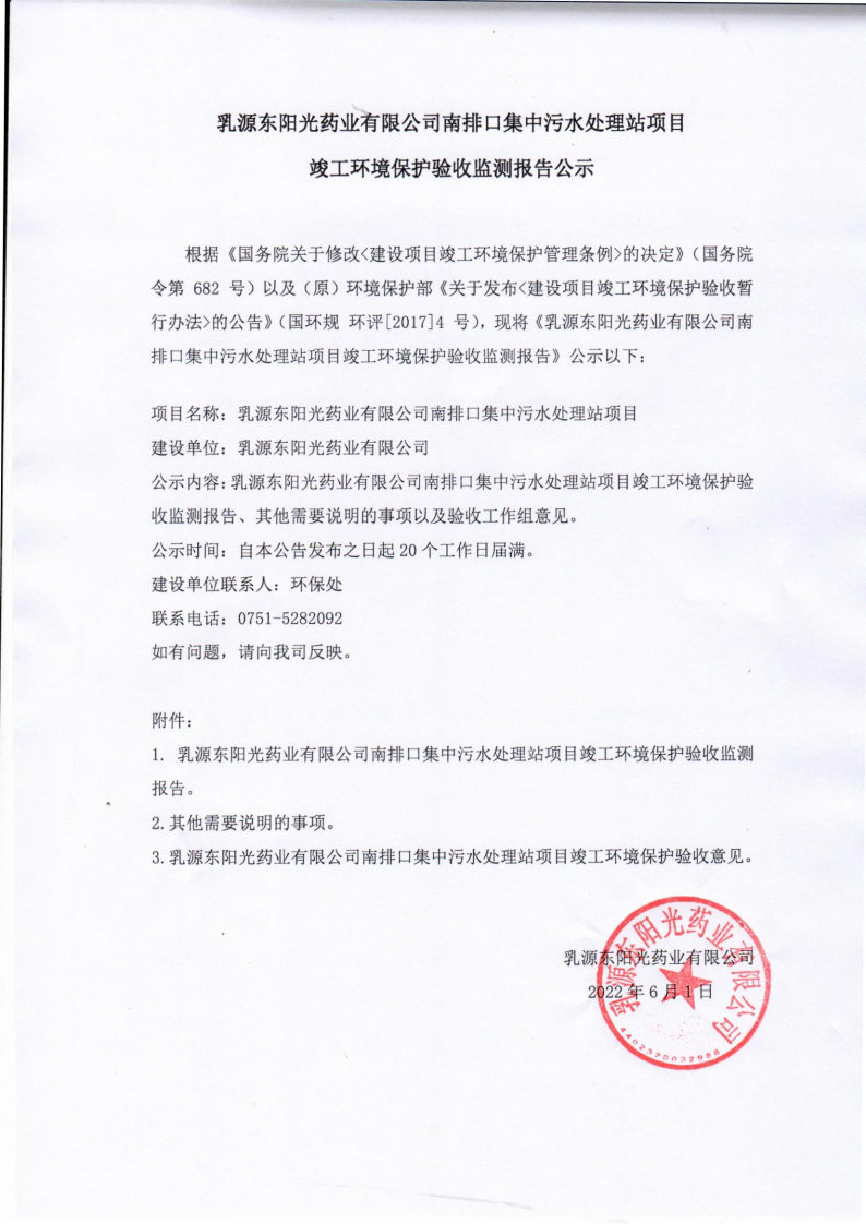 Ruyuan HEC Pharmaceutical Co., Ltd. South Drainage Centralized Sewage Treatment Station Project Completion Environmental Protection Acceptance Monitoring Announcement