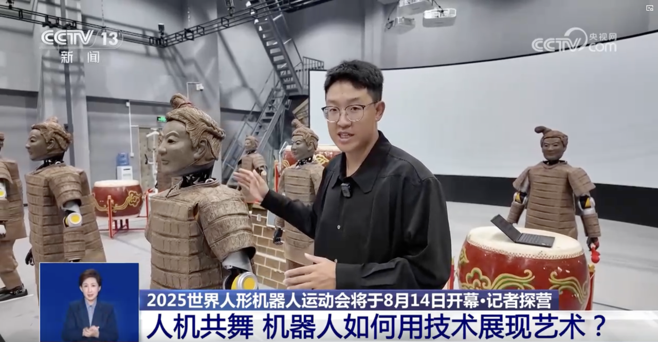 2025年8月14日晚,在“2025世界人形機器人運動會”開幕式上,由光谷東智與北京舞蹈學院聯(lián)合打造的全球首創(chuàng)大型人機共舞節(jié)目《秦俑魂》震撼亮相,中央電視臺《共同關注》欄目對此做了專門報 道。