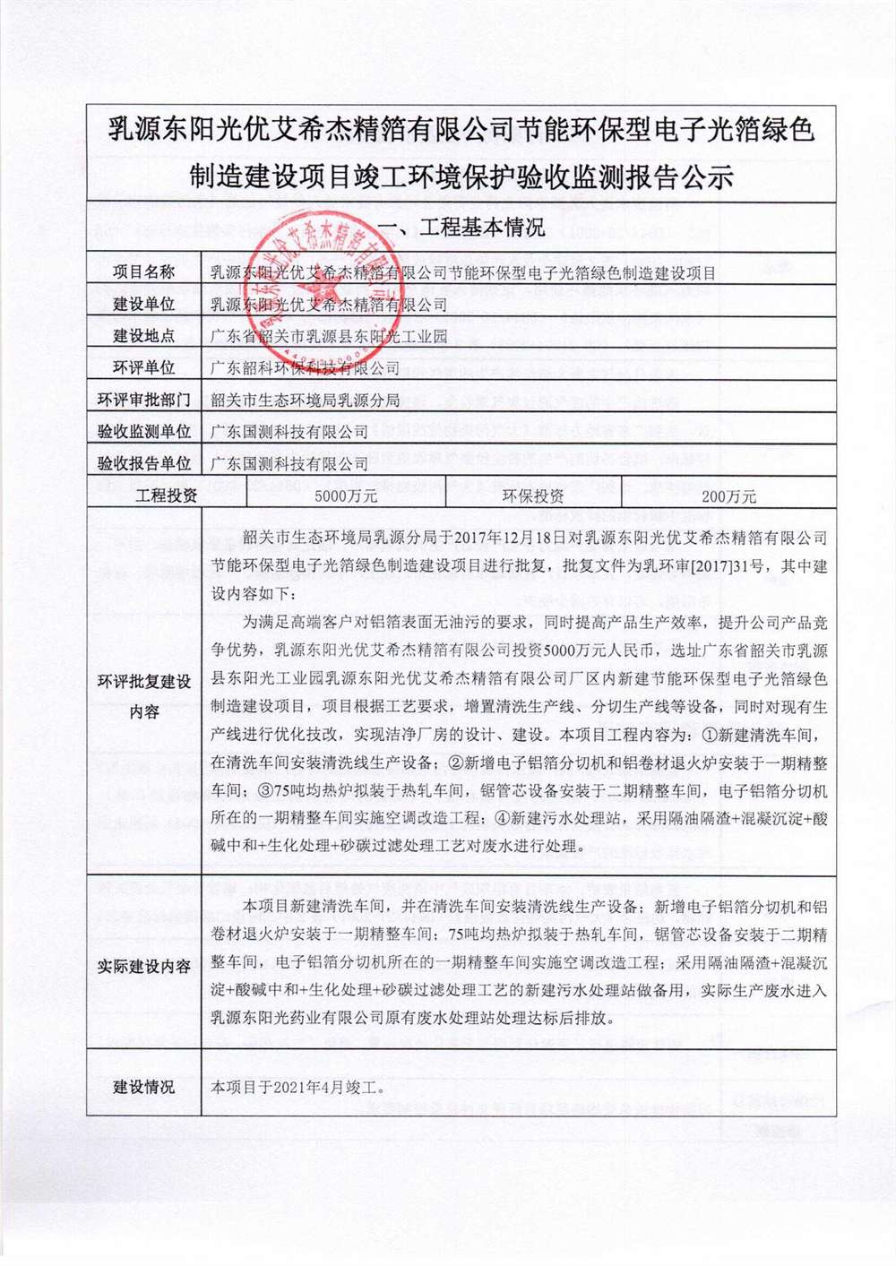 乳源東陽光優(yōu)艾希杰精箔有限公司節(jié)能環(huán)保型電子光箔綠色制造建設(shè)項(xiàng)目竣工環(huán)保驗(yàn)收公示