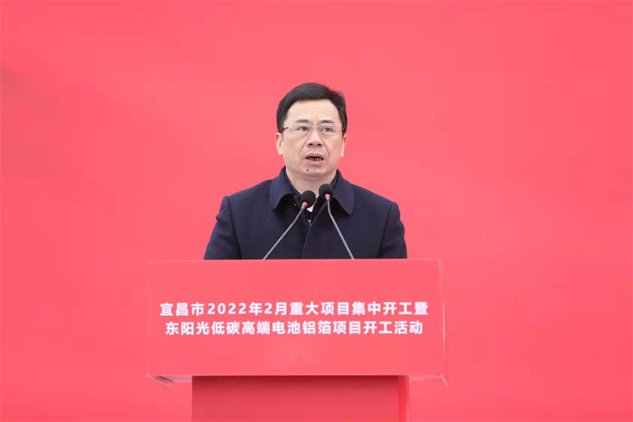 2月8日,2022年一季度湖北省重大項(xiàng)目集中開工宜昌分會場活動(dòng)——宜昌市2022年2月重大項(xiàng)目集中開工暨東陽光低碳高端電池鋁箔項(xiàng)目開工活動(dòng)在電池箔項(xiàng)目建設(shè)現(xiàn)場隆重舉行。湖北省副省長、宜昌市委書記王立宣布項(xiàng)目開工,宜昌市委副書記、市長馬澤江主持活動(dòng),宜昌市副市長、宜都市委書記譚建國參加活動(dòng)并致辭,集團(tuán)董事長張?jiān)涀黜?xiàng)目介紹。